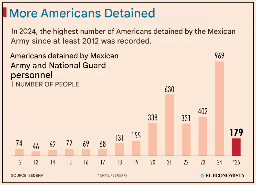 The number of U.S. citizens detained by Mexican Army and National Guard personnel has steadily increased in recent years. Official records, spanning more than 13 years (from 2012 to February 2025), show that 3,526 Americans have been apprehended; more than 80% of these cases have occurred since 2018.