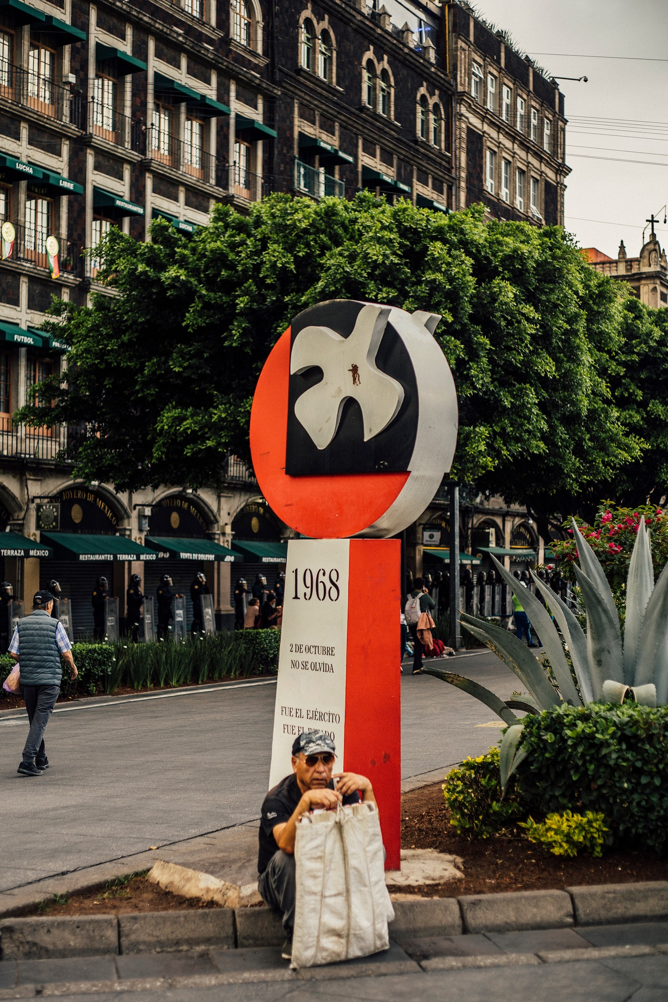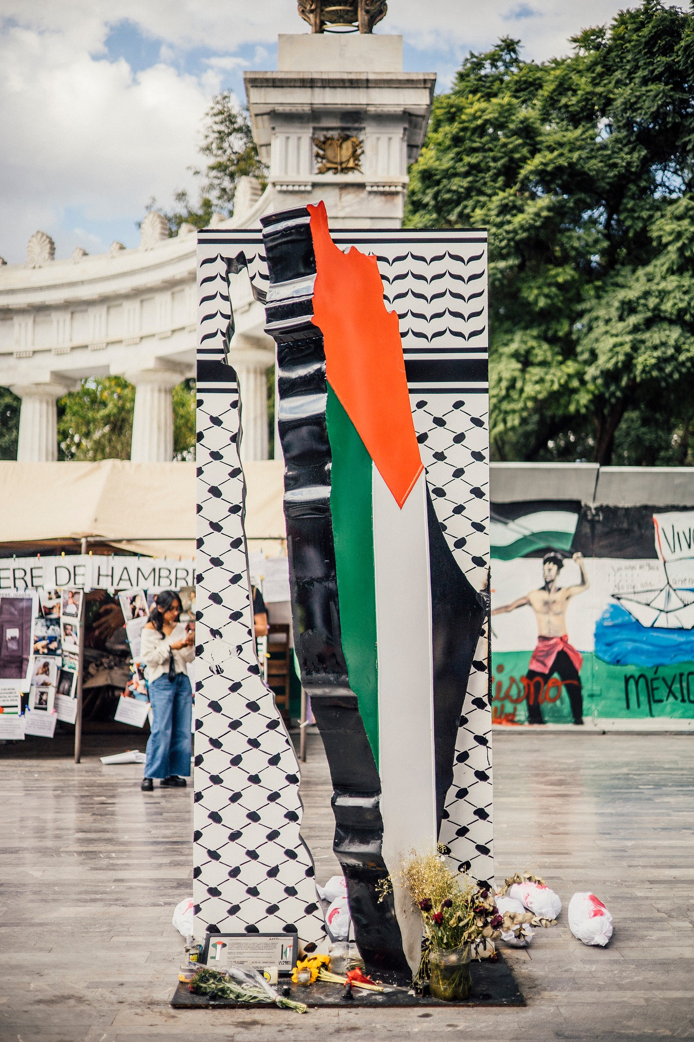 The only memorial where people are guarding its safety is the so-called anti-monument, located on Avenida Juárez, across from the Palace of Fine Arts. The metal structure is surrounded by banners, photos, and posters denouncing the government’s inaction against femicides.