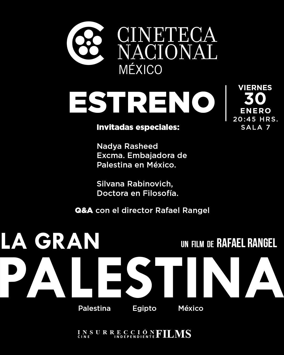 Greater Palestine is screening at Cineteca Nacional de México in Mexico City, 20h45 on January 30. (Av. México Coyoacán #389, Col. Xoco, Benito Juárez, 03330, Ciudad de México) Special guests include Palestinian Ambassador to Mexico Nadya Rasheed and Palestinian solidarity activist and philosopher Silvana Rabinovitch.