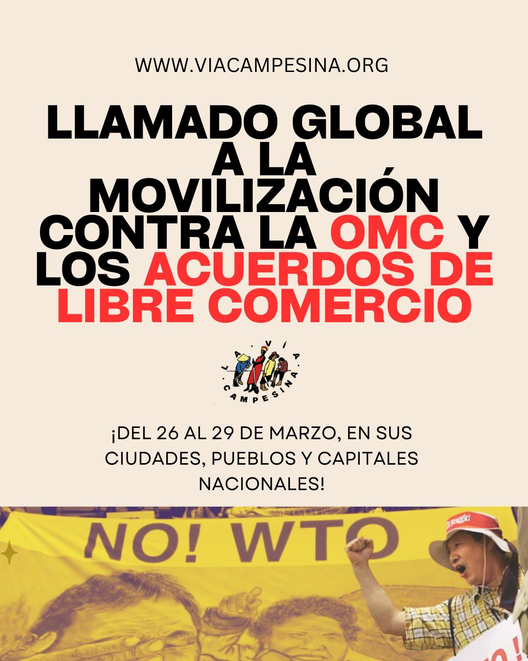 We call upon all our members and allies to organize mobilizations, press conferences, and public meetings in their towns, cities, and national capitals between March 26 and 29, 2026 , to express their opposition to free trade agreements that violate our rights and to reiterate our demand to keep agricultural trade negotiations outside the WTO.
