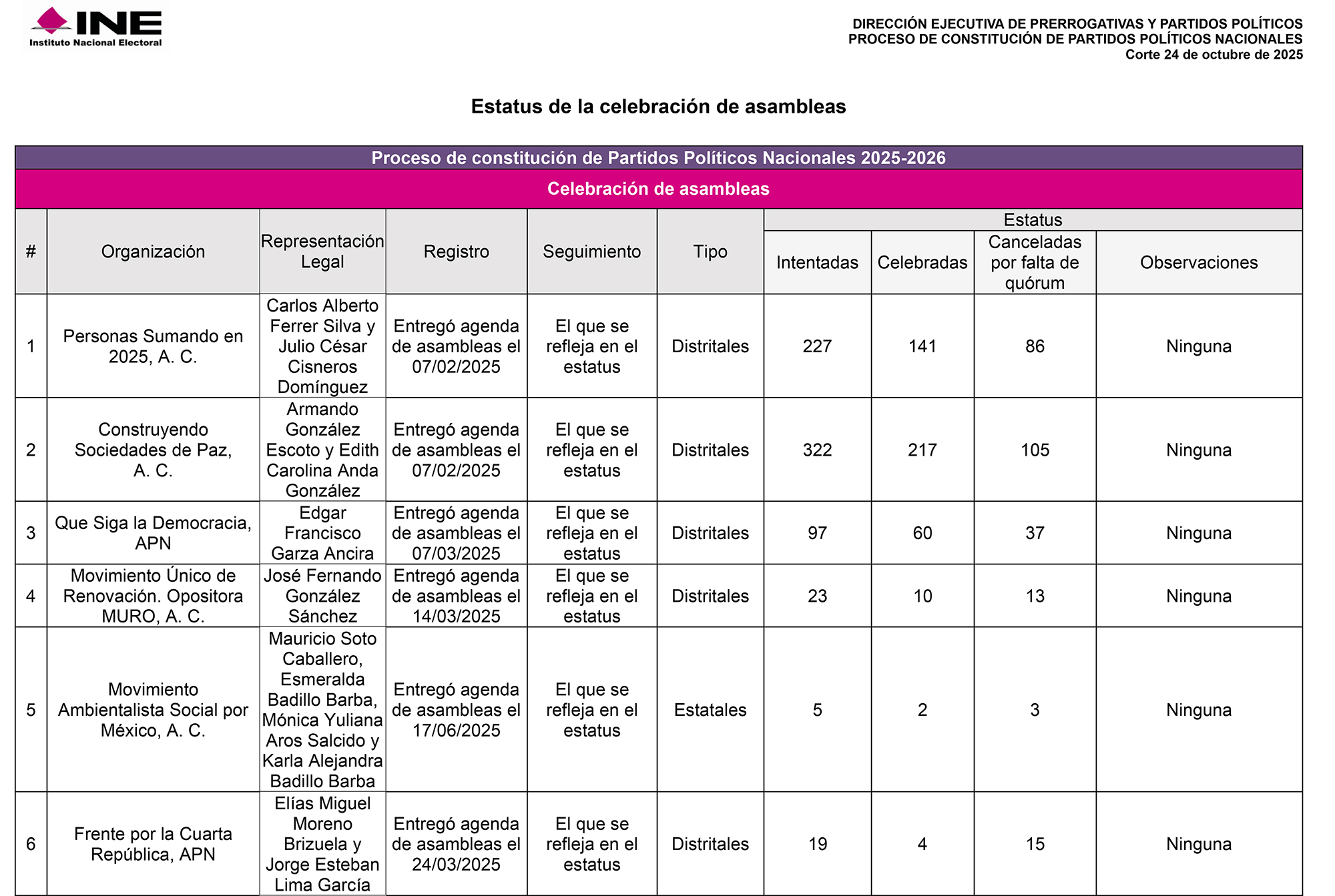 For an organization to obtain registration as a national political party with the INE (National Electoral Institute) and therefore be able to compete in the 2027 elections, it must have held at least 20 state assemblies or 200 district assemblies with a minimum of 3,000 members in the first case and 300 members in the second. It must also have at least 256,030 members in total, equivalent to 0.26 percent of the federal electoral roll.