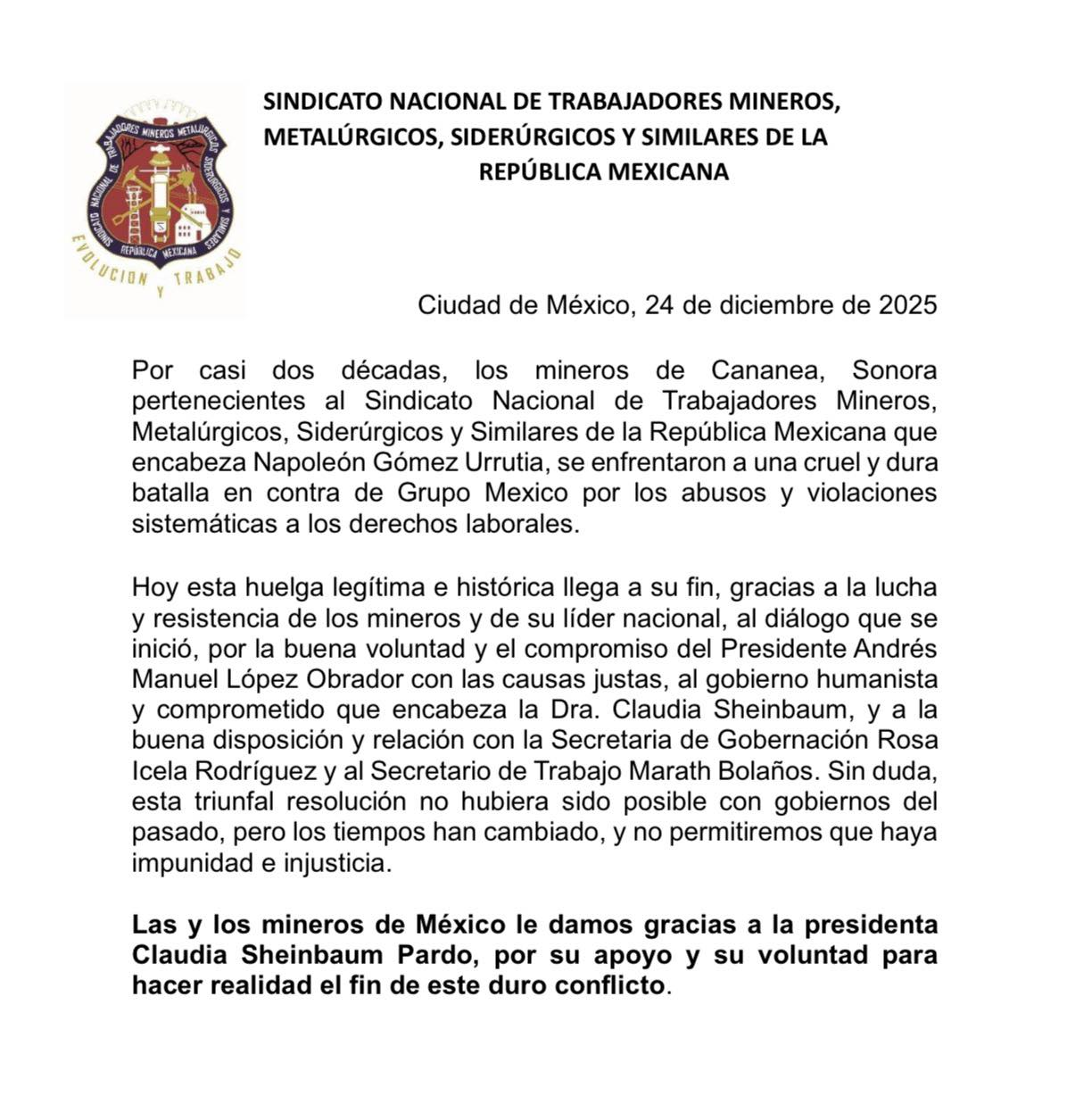 Mexico City. After the agreement ending the more than 18-year strike in Cananea, Sonora, was formalized this week, the national leader of the National Mining Union, Napoleón Gómez Urrutia, thanked President Claudia Sheinbaum for her support and willingness to “make the end of this difficult conflict a reality.”