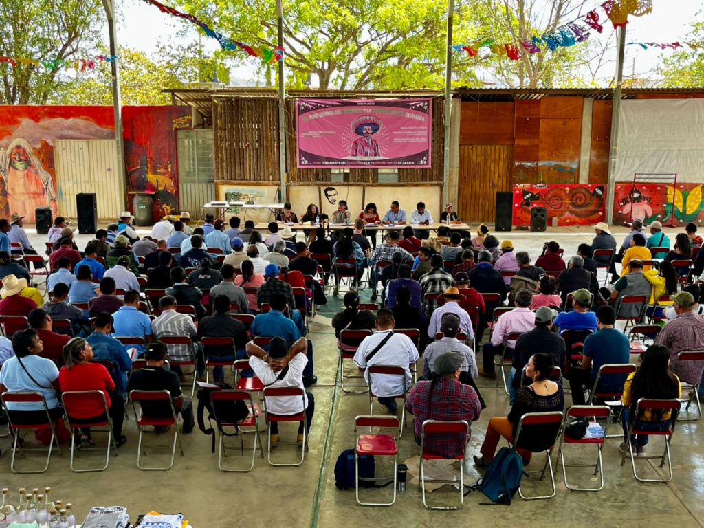This space will have the following objectives: To strengthen community organization and regional articulation for the defense of social property and territory in Oaxaca, to analyze the implications of current reforms in agrarian, territorial and indigenous matters, to evaluate the impact of the extractivist model in our territories, strengthening our common agenda for the defense of social property in Oaxaca to promote legal, organizational and political strategies for the protection of our collective rights and communal territory.