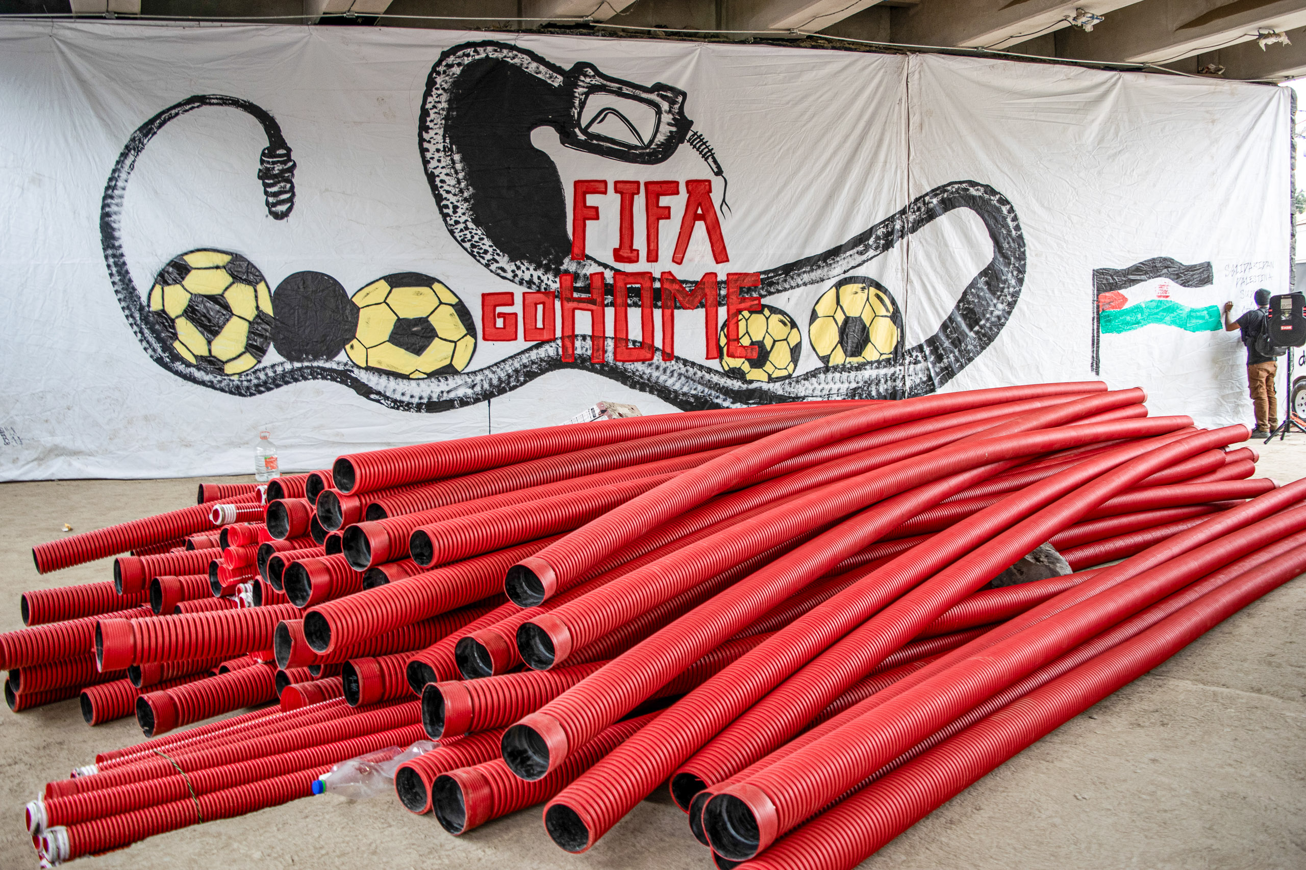 One hundred meters from the Azteca Stadium, Thelma Díaz is cleaning the dust covering her plants, furniture, and water tank for the second time this week. She lives on San Álvaro Street, from whose rooftop she can see the building that will host the opening ceremony of the World Cup in 100 days. Below, on the street, the machinery never stops.
